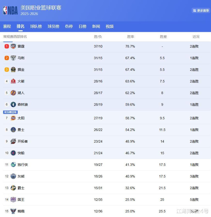 雷霆队战绩37胜10负,虽然领先幅度变小,但还是稳居西部第1的位置!而西部第2的席位,大概会从这4支队伍中产生!