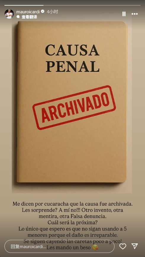 今日,伊卡尔迪更新社媒回应,他晒出一张附有“刑事案件已结案”字样的图片,并配文:“又是一次捏造,又是一个谎言,又是一桩诬告。”