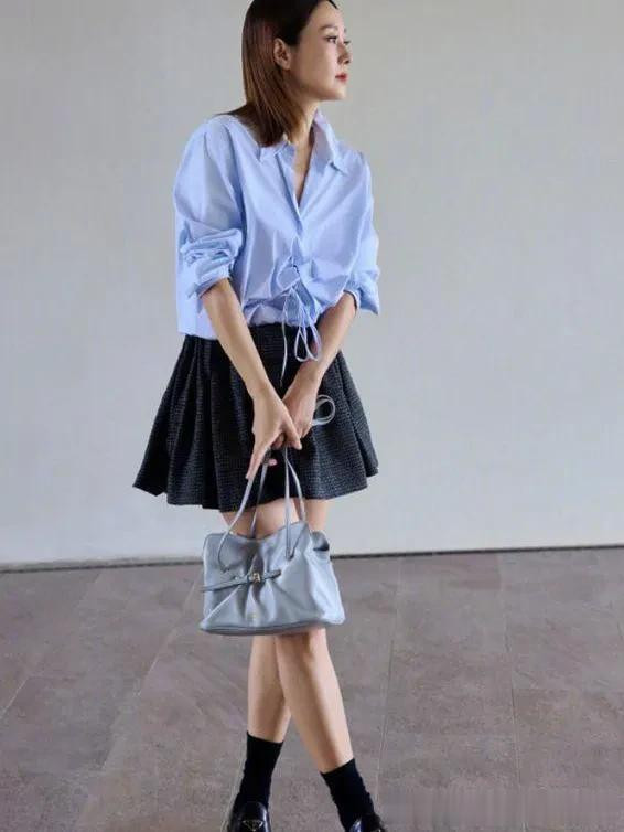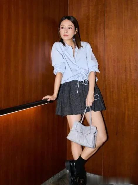 马伊琍剪了齐肩短发年轻10岁! 穿蓝衬衫+短裙+乐福鞋, 时髦高级