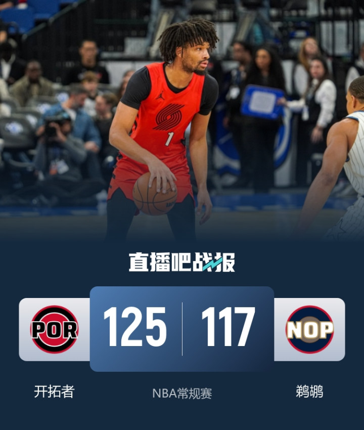 此役一上来鹈鹕率先发力连中三分,13号秀奎因发挥亮眼,阿夫迪亚外线回应稳住局势,开拓者稳扎稳打逐渐占优,首节结束时开拓者领先5分,次节回来,格兰特与米西爆发冲突均被驱逐,夏普突然爆发单节独得13分,两队你来我往比分紧咬,半场战罢,鹈鹕反超2分。易边再战后霍勒迪得分组织一把抓,率队连续轰出得分高潮,三节结束后开拓者确立10分优势,末节上来,鹈鹕没有放弃不断蚕食分差,阿夫迪亚关键三分终结悬念,最终开拓者125-117力克对手终结连败,同时送给鹈鹕三连败。
